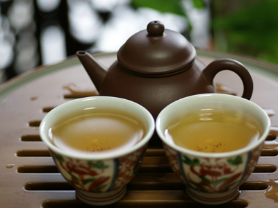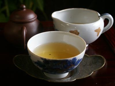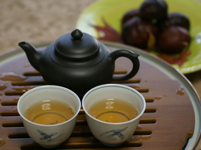 「…今日も、あまり、よろしくございませんね。」「そのようですね。」「それがし、鉄観音がこれほど難しいとは、思っておりませんでした。」「確かに…。」「鉄観音ですよ! 温めた茶器に沸かしたてのお湯をとぽとぽと注げば、それだけで美味しいお茶になると信じておりましたのに…。」「香りが出てませんからねぇ…。」「アルカリイオン水がいけないのかと、ただの浄水を使ってみましても根本的なところは変わりませんし…。」「後から感じる香りや口の中の滑らか感からして、もっと表に立つ香りがあってよいと思うのですが…。」「実はそれがし、寒舎で三等獎のお茶をいただきました時も、一回目あら?こんなもの?と思ったのでございますよ。で、そのお茶を四煎目くらいまでいただいた後で一旦茶葉を替えましてね、そうしましたら、その時のお茶は一回目のお茶とはベツモノ!でございまして、いえ、どちらも同じ筒に入ったお茶だったのでございますが、まさに香りが全然違ったのですよ。今のお茶は、まさにその時の一回目なカンジなのでございますが、あの時も一回目と二回目、特に淹れ方に違いがあったとは思えないのですが…。」「悩ましいことです。」「次はいっそ、比賽方式で淹れてみましょうか…。」「そうですねぇ。とにかく、なんとかしないことには、このままではお茶が気の毒ですからねぇ…。」「ところで、日本人の感性…と申しますか、茶道のお約束から致しますと、御道具の木目は自分と平行になるように、というのがお約束なのでございますが、竹茶盤は垂直になるように置くものなのでしょうか…。」「さぁ…。」「こうやって呟いておきましたら、どなたかご親切な方が教えてくださるでしょうか。どうぞ、よろしくご教示ください。」