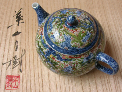 お願いしてから二年…は待たなかったでしょうか。有田の細密画の巨匠葉山有樹氏の煎茶セットがようやっと出来てまいりました。お題は“天遊”。かわいらしいお子たちが、目出度い景色の中で遊び戯れている図でございます。茶壺・湯冷ましと茶杯6個をセットにしたこの煎茶セット、いわゆる工房作品ではなく、すべて葉山氏が自らお書きになったものでございます。茶杯をひっくり返して葉山氏のサインでございます。底にもびっしり書かれた絵柄…虫眼鏡で拝見いたしませんと、そのウツクシサを堪能できないとは、なんという技巧でございましょう…。ほぼ原寸大…いえ、原寸よりちょっと大きいくらいの茶杯の中の絵でございます。これを大きくしてみましょう。サスガは葉山氏、うっとりの手芸でございます。煎茶道のお道具は、茶道のお道具に対して“おママゴト道具”と言われることもあるらしゅうございますが、このセットはもはや芸術でございますね。しかし、このようないわゆる“食器”の類は、手がかかるわりに高いお値段をつけにくい、という事情があるらしゅうございます。お茶壺とほぼ同じ大きさの香炉一個のお値段と、この一揃がおんなじお値段と申しましたらちょっと大袈裟かも知れませんが、それに近いものがあるそうで…。そのお陰でそれがしも、このお煎茶セットを持たせていただくことが出来るわけでございますが、それにしても、日本はやっぱり手書きのお値段がお安い…と、ヘレンドのシノワズリーシリーズなどと比べてみましても、つくづく思う今日この頃でございます…。いや、あちらがお高すぎるのかも…。
