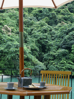 中国茶っていいかも…と思い始め、なんとな~くそれらしいお店を探しておりました頃、たまたま出会ったお店がございます。台湾福茶さんとおっしゃるお店なのですが、ナンにしろ店長さんがご熱心なのでございます。まず、お茶葉にかける情熱が尋常ではございません。そして、そのお茶をお作りになった茶農さんのお人柄まで伝わってくる商品情報に惹かれ、お試し用の茶葉を何種類か注文させていただいたのですが、その中にたまたま木柵正[木叢]鉄観音2003年冬茶というのが入っておりまして、これがまぁ、目からウロコと申しましょうか、もう、まさに青天の霹靂のようなお茶でございまして、まさに撃たれてしまったのでございますよ、もう後戻りが出来ないくらいに…。思えば、あのお茶との出会いがなければ、それがし、ここまでどっぷり中国茶におカネを注ぎ込むこともなかったろうと、斯様に思うワケでございますが、出会ってしまったものはしかたがございません。その鉄観音をお作りになった方、張福欽さんとおっしゃいます。この張さん、かってNHKの台湾紹介番組にも出演されたことがございまして、たまたまそれを見かけたそれがし、台北市から30分くらい参りましたところの猫空という山の中に、張さんの寒舎という茶芸館があることを知ったのでございます。以来、ず~~~っとこの寒舎に行ってみたいと思い続けていたのでございますが、4回目の台湾でやっと念願叶いまして行って参りました。猫空までの行き方は、旅々台北ストア流々茶房さんのHow to 猫空を参考にいたしまして、ゴンドラが運休中でございましたので、万芳社区駅からバスで…と思いましたら、1時間に1本程度しかないバスがちょうど出たところのようでございましたから、仕方なくタクシーで参りました。この寒舎、かなり奥の方にございますので、タクシー代は185元でございましたが、バスでしたら15元でございます。ナンと申しますか…山の細い農道の脇に、茶芸館が点在しているような趣なのでございますが、奥まったところにある寒舎は、その“女の子が一人ではちょっと怖いかも”感も一入でございます。別の茶芸館への入口と道が分かれて、上に登って行く道をズンズンと行けば寒舎に着くのでございますが、ナンとその道すがら、木の上にリスを目撃いたしました。野性のリスを目撃いたしましたのは、それがし、生まれて初めてでございます。そのように自然観察をいたしながら歩いておりますと、黄色い看板と寒舎という大きな赤い字が目に飛び込んで参りまして、寒舎に到着でございます。ドキドキ…。憧れの、張福欽さんの寒舎でございます。。。間もなくサービスカウンターに到着いたしまして、そこでお茶とお茶請けを購入し、茶水費として1人50元をお支払いいたします。茶芸館の中には、点心や食事まで提供するところもあるというウワサでございますが、ここ寒舎では、お茶が御馳走でございます。カウンターの脇に、お菓子棚がございまして、お茶請けはそこから選ぶか、点心もあるにはあるのでございますが、ジュースの入った冷蔵庫の下が冷凍庫になっておりまして、そこから取り出したおまんぢゅうやシューマイが蒸されて出ていらっしゃるのでございます。さて、ここ寒舎は広大なオープンカフェテラスと申しますか、山の斜面にいくつか東屋?なカンジの屋根付きのブースがございまして、そこに机と椅子と蚊取り線香受けが置いてあり、自然の中で鳥のさえずり・蝶の乱舞、時に一寸ムカデの襲撃と、なかにはスリリングなショーもございまして、それらを楽しみながらゆったりとした時間と空間に身を任せてお茶に酔うわけでございます。カウンターで注文したお茶は、御道具と一緒に後から持ってきていただけるワケでございますが、この広い敷地内を勝手にウロウロして席を探すというのに、どうして何処にいると分かるのかしら…?と、ちょっと不思議な気が致します。お茶と一緒に、蚊取り線香も参ります。で、このようにまったりとお茶を楽しむわけでございます。本日のお茶は、優良鉄観音コンテストで参等獎の特級鉄観音250元でございます。他にも高山烏龍や金萱、東方美人等の茶葉もございまして、お値段は概して250元でございました。ご飯を炊くには、そのお米が育ったところの水で炊くのが一番だと申しますが、お茶もそのところの水がよく合うのではないでしょうか。。。今年の張さんの春茶は、台湾福茶さんで既にお試し済みだったのですが、やはり比賽茶の実力か、弱いと思っていた香りがふっと立って、それがし思わず、ホーけてしまったではありませんか!このように美味しいお茶がいただけて、それがし、幸せでございます。。。つらつら申しておりますように、中国チックな家具を配したおシャレな空間で、美味しいものをいただきながらついでにお茶でも、というのがお好みの方には、この寒舎はおススメいたしません。とにかく美味しいお茶が一番!とい