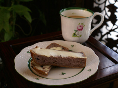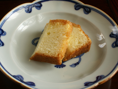 え~、本日ちょっと鉄観音をいただきたいキブンになりまして、久しぶりに玄珠公子とまったりお語らいなど…と思ったのでございますが、昨年香港に参りました折、楽茶軒のおねーさんにいただいたものがあることを思い出しまして、それをいただいてみることにいたしました。大陸の鉄観音は、2002年9月にこれまた香港でいただいて以来だったのですが、何故そういうことになったかと申しますと、その頃まだ中環にございました中芸で、そちらのおねーさんに見事な手芸でお淹れいただいた安渓鉄観音があまりインパクトのないお茶でございまして…。その後、台湾の鉄観音でもう、ナミダが出るかと思うばかりに素晴らしいものに出会ってしまいましたもので、以来ずっと木柵鉄観音onlyだったのでございます。折りしも鉄観音をめぐる話題がそれがしのまわりにいくつかございまして、楽茶軒のお茶でしたらそうひどいことは無いだろうと思いつつ封を切ったのですが…。結局玄公子とのお語らいは、急遽鉄観音二種類飲み比べへと変更になりまして、飲み比べに玄公子のお出ましはもったいないというコトで、梨花さんが安渓鉄観音を、木柵の張さんの鉄観音は蓋椀を使ってお試しすることといたしました。結果は茶々是好茶に鉄観音の事情としてUPいたしておりますので、お時間がございましたらこちらをご覧くださいませ。鉄観音の飲み比べに用意いたしましたのがこちらのレモンケーキでございます。クィーンアリスのレシピで作ったものなのですが、生のレモンの皮をすりおろして入れますので、完全無農薬保障のおばーさまのところのレモンをいただいてこないことには作るコトができないケーキなのだそうでございます。お砂糖たっぷり、サワークリームたっぷり、カロリーもたっぷりの、ちょっとつまんだだけで食べ応え十分! だけどつい、さらに手が伸びてしまうという、かなりオソろしいケーキでございます…。