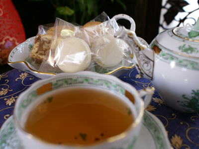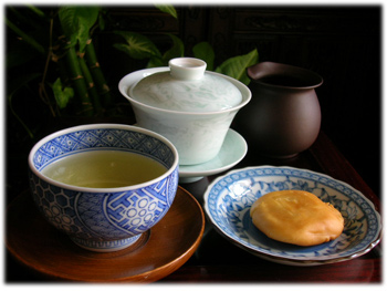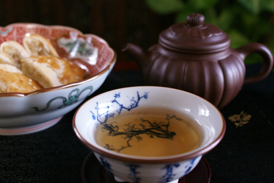 今から20年ほど前、大陸から台湾へ肉桂・八仙・水仙等の茶葉を移植された方がおられまして、あるのでございますよ、台湾にも肉桂が!これは、台北の意翔村茶業有限公司で求めました二〇〇五年冬茶でございますが、大陸から肉桂を持って帰られたのはまさに、ここの陳煥堂老師とそのお仲間の方々でございまして、台湾肉桂の総本山とでも申せばよろしゅうございましょうか。茶葉をご覧いただければお分かりのように、大陸のものとはちと、製茶方法が違っておりますでしょ。こちらは中発酵中焙煎で、しっかりめに柔捻がかけられており、ちょっとほどけたパンチパーマ状でございます。柔らかい甘みと、トーンの高い香り…。この年のお茶は、複雑な花の香りがいたします。ボディはさらりと軽め。杯に残った香は甘く、あくまで甘く…ふぁ~!ちょっと、コーコツの世界に入ってしまいました。。。求めましてすぐいただいた時も、香りのインパクトが強いお茶でしたが、時を経てこう、ボディがますます軽くなったと申しますか、ふわっとこう、舞い上がるようなカンジ、とでももうしましょうか…。かといって、旨味もしっかりしているのでございます。そう、こう、一皮むけたと申しますか、そんなカンジでございますね。七煎目いただいたあとでございます。「白椿さま、このお茶は煎を重ねても、香り・お味ともにしっかりしてますわね。」そうでございますね。ゆるやかに表情を変えながら、しっかりと自己主張をする、良いお茶です。でも、これ以上置くとどうでしょう…。そろそろここら辺りが限界のような気がしないでもありませんが…。「ところで、今日のお茶請けは?」そりゃあなた、更新しっぱないだった人生最高が、ちょっと下向いたような気がするんですから、お茶だけでガマンの日もあっていいのではありませんか、ねぇ…。