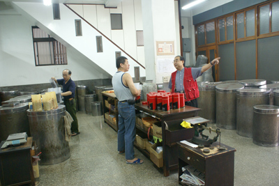 前回台湾へ参りましたのが5月の末でしたから、東方美人は去年のものをちょこっと求めて帰ったのでございますが、今回は今年のものをGETすべく、寒舎の帰りに木柵線を大安で降りて、意翔村茶業へ行くつもりでおりましたところ…つい、ひもじさに負けて忠孝復興まで戻ってしまい、尚且つソコから何故かディープなおタク世界へと流れて行ってしまった為、ついに意翔村茶業へは寄ることが出来ず、とうとう帰国の朝を迎えてしまいました。東方美人は是非とも欲しい。しかし、意翔村まで行くには、ちょっと時間に不安が…。なにせここは、一度入ったら2時間コースでございますから…。ということで、ふっと思い当りましたのが、前回友人某の行きつけということで一緒に参りました林華泰茶行。だいたいの場所を覚えておりましたので、地図で確認すると、ホテルからさほど遠くもございません。問題は営業時間と住所。タクシーに乗るとき、はっきりと住所が言えないと、なかなか困ったことになってしまいますので。ということで、ここはさっそくホテルのおにーさんの出番でございます。レセプションに参りまして、ここに行きたいと告げると、後は何も言わなくてもおにーさんが住所と電話番号を調べ、今開いてますか?と聞いてくださいます。そして、「お客様が参りますのでよろしくお願いいたします。」ということで、後はタクシーの運転手さんに見せる住所メモを作成してくださり、「いってらっしゃいませ」となるわけでございます。今回それがしが宿泊いたしましたのは、林森北路と民族東路の交差点にある欧華酒店というホテルだったのでございますが、お値段の割にクォリティの高い滞在を楽しむことが出来ました。小潘の鳳梨酥も、明福台菜海産の仏跳牆も、予約してください!で予約できてしまうのです。これは…癖になるかも。。。いえ、明福の仏跳牆は、もう二度とないと存じますが…。で、それがし8:30から林華泰茶行へ出かけて行ったワケでございますが、お店の前でタクシーのドアを開けたとたん、お茶を炒る良い香りがいたします。この、お茶を炒る香りというのはナンともいいものでございますね。このお茶屋さんは1883年開業の百年老店でございまして、大門や渋谷の華泰茶荘とは社長さんがイトコ同士なのだそうでございます。と申しましても、ここ重慶北路の店舗兼倉庫兼製茶場のお店は、華泰茶荘のような高級感あふれる造りではございませんで、大きな筒状のお茶缶がズラリと並べられ、蓋の上にお茶の名前と1斤当りのお値段が大書されておりまして、そこから好みのお茶を選ぶわけでございます。今回は東方美人が目当てでございましたので、その旨を申しますと、直様奥の小部屋へと連れて行っていただきました。大きなお部屋にはかなりリーズナブルなものもイロイロと揃っておりますが、こちらのお部屋は1000元くらいからのお茶で占められております。東方美人は3種類、1000元、1600元、2400元とございまして、1000元のものから開けて見せてくださったのですが、これはちょっと茶葉が大きいな~という印象でございました。1600元になりますと、少々細かくなり、また白いモノも多くなって参ります。最後に2400元の缶を開けていただいたワケですが、コレを見たらやっぱりコレでございます。自分用に半斤、お土産に1/4斤(2両)入れていただきまして、さて、と見渡しましたら、そこにはやっぱり2400元の文山包種が。。。それも2両入れてください、で終わるかと思いましたところ、またまた目に入った4000元の高山烏龍。それがし、はっきり言ってこの高山系のお茶はちょっと苦手なのでございますが、この時つい、魔が差したと申しますか、このくらいのお茶だったら、いつもナンだかモノ足りないような気がする、いわゆる「高山気」というのが感じられるのではないかと思ったような気がすると申しましょうか、なんてことない、タダの衝動買いと申しますか…。それもまたまた2両と、つい、うっかり口を滑らせてしまいました。。。昨日の1斤6000元で、完全におかしくなっていたと言えなくもないかもしれません。しかし、華泰茶荘のお茶の値段を知っていれば、つい、「あっら~!お得!」と思わないでもないというキモチも、御理解いただけるのではないかと…。ということで、こちらの販売はすべて簡易包装で、単位も1/4斤150gからでございます。ふと思いますに、ここは安いものから順番にお茶を見せてくださるのですが、2回が2回とも買い手が望まなければ、それ以上高いお茶の蓋は取りません。それはやはり、その値段・値段に応じた品質に対する自信の表れのようにも思いますし、また、その経営方針が決して儲け至上主義ではないことを示しているようで、好感が持てる次第でございます。お茶とのお付き合いの仕方は、人それぞれでございますから、毎日気軽にいただけるお茶から、ちょっとどうかと思うような道楽のお茶まで、選択肢が多いというこ