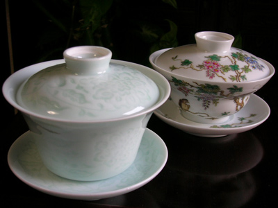 これまた香港でのお話なのですが、それがし、茶具文物館に入っております某お茶道具屋さんで、ちょっとイイカンジの蓋碗を見つけました。青磁刻花紋のその蓋碗のお値段は、なんとも中途半端な1000H$。というワケで、その日はほとんど初日でもありましたし、何処かで景徳鎮のイイモノに出会ったときのため、そのまま“さようなら”となったのでございますが、なかなかいい巡り合いもないままに最終日と相成りまして、九龍の中藝に駆け込みましたところ、なんと、同じモノがあったのでございます。しかもこちらは、980H$と、もとのお値段がちょっとお安い上に、なにやらセールが重なって、400H$だとおっしゃるのです。これは、買わずば帰れまい…。さらにそれがし、もう一つ、粉彩が施されたクラシックな容のものにも目が止まりまして、それは440H$くらいのものだったのですが、300H$にオマケしてくださるとおっしゃいます。しかも!二つ併せるとこれが650H$になるというのですから、つい、二つとも抱えて帰ってきてしまったと、こういうワケでございます。どちらもいわゆる作家モノではなく、職人さんが作った大量生産品なのですが、一応は手彫り・手書きでございますから、普段使いとしては十分ではないかと、それがし斯様に思うわけでございます。というワケで、先日来この新しい蓋碗でお茶を淹れてみることが多いわけでございますが、残念ながら蓋碗には、お育ちになる楽しみはございません。しかし、一人で静かにお茶をいただきたい時には、それもよろしいかと…。