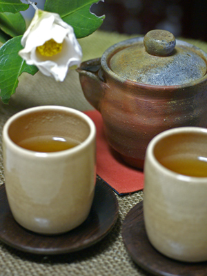 朝晩すっかり冷え込むようになりまして…もう、冬でございますね。それがし、夏は冷た~く冷やした中国茶で、また冬は熱~い中国茶でお茶漬けをいただくことを最上の贅沢と位置付けております。“お茶漬け”と申しますと、なにやらあまり高尚でない食べ物のようにお考えの方もおいでになるようでございますが、これがあなた、ついうっかりハマってしまったら後にはひけない、なんとも甘美な口福の世界が、そこには待ち受けているのでございます。ホンジツのお茶漬けは、それがしが茶仙さまとお呼び申し上げ、御尊崇申し上げている意翔村の陳煥堂老師が作られた古典美人茶にいたしましょう。このお茶は、翠玉やらナニやらをブレンドして中発酵中火焙で凍頂烏龍風に仕上げたお茶でございまして、しっかりとした酸味と香ばしい焙煎、それにも負けない華やかな花香が、お茶漬けにしても決して個性を失うことのない強い主張を持って、しかも調和的に存在している、実に素晴らしいお茶と申せましょう。本日使用いたしましたのは、昨年いただいてまいりました冬茶でございます。思い起こせば、初めて茶仙さまをお訪ねした折、このように素晴らしいお茶をどうしてこのように安価に販売なさるのですか?と茶仙さまにお尋ねいたしました。茶仙さまは、「お茶は自分の娘と同じだ、早く嫁に行かせてみんなにいい娘だと褒めてもらいたい。だから高い値段はつけない。」と仰いました。ああ、いいお嬢さまなのでございます、この古典美人さんは。ということで、本日のお茶漬けと相成るわけでございますが、トッピングは京都三宝庵の山椒こんぶと、博多ふくやの明太子でございます。明太子はかる~くあぶって…が、それがしこのところのマイブームでございます。どちらもいただき物でございますが、お茶漬けにはもってこいの、しめしめ…でございます。お茶碗は北村宗善の蛸唐草、これは抜き唐草というヤツでございますね。普通に唐草を書くよりも手間がかかりますので、絵付師さん泣かせの模様でございます。そしてお茶を淹れるのは備前宝瓶。焼き締めと染付け、コントラストが効いて、食欲倍増な取り合わせでございますね。この宝瓶、インチキにたっぷりとお茶をいただくのに、なかなか重宝いたしております。こうしてみましたら、お茶漬けもなかなかに侮れないものでございましょう。お茶とトッピングのバリエーションで、口福の世界が無限に広がっていくのでございます。ふふふ…。「白椿さまったら、今日もそのブサイクちゃんと一緒なのね! あたしたちはもうすっかり秋の扇ってわけ?」「まぁ…またそんなゼイタクなお茶の召し上がり方を…。」「このヒトは“ブサイクちゃん”というお名前ではありませんよ。それに、ほら、去年のお茶は早くいただいてしまって、今年のお茶をいただきに参らねば…。」