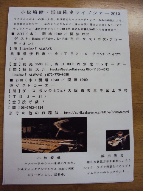 Rie先生のご親戚のハンマーダルシマーの日本第一人者、小松崎健さんが関西でツアーを行います☆ラグタイムギターの浜田隆史さんとのタッグで、伊丹と天王寺でのライブ。是非、お誘い併せの上、お越し下さい!お問い合わせは、上記画像の電話、またはスタジオ(078)737-0277まで(=^-^=)ノちなみに・・・Rie先生のクラシックバレエクラスは毎週土曜日の19:15~20:45で好評開催中です!こちらも随時お問い合わせ、体験受付中です。 近畿兵庫県・神戸須磨・板宿駅上すぐ!ダンススクール「スタジオWAY」★3階6階ダンススクール★クラシックバレエ(幼児・キッズ・学生・大人の美容バレエ)HIPHOP(幼児・キッズ・ガールズヒップホップ・ママヒップホップ) ブレイク(ブレイクダンス)キッズチア(キッズ・ジュニア)ジャズダンス(ファンク・キッズ・スロー) 子供ミュージカル★様々なコースが魅力です★■普通科■月の回数内、毎週同じクラスでも、色々ジャンルを混ぜてもOK!エンジェル(2、3歳 ご一緒にお母様)2100円(45分/月4回)ミニキッズ(2歳~年長)4,500円(45分/月4回) 2科目8,000円(月8回)キッズA(小学生1年生~3年生)6,000円(60分/月5回) 2科目11,000円(月10回)キッズB(小学生4年生~6年生)6,000円(60分/月5回) 2科目11,000円(月10回)ジュニア(中学生)6,000円(60分/月5回) 2科目11,000円(月10回)一般(16歳以上)6,000円(60分or90分/月5回) 2科目11,000円(月10回)一般フリー(16歳以上)12,000円(60分or90分)■育成コース■12,000円(所定クラス4回+フリー)コンテスト、外部出演メインのクラスです。オーディションに合格された方のみでワンランク上のレッスンに挑戦。コンテスト入賞を目指します。■芸能コース(TV映像・舞台)■12,000円(所定クラス4回+バレエ、チアからフリー)半年に1回、芸能プロダクションのマネージャーが来校。次回は2010年2月後半です。演技、ダンスのレベルチェックと説明が有ります。映画やテレビドラマの紹介が有り、エキストラから挑戦出来ます。◆3階社交ダンス教室◆■チケット1,000円~1,250円(G1回1枚・個人3枚25分)■グループレッスン、個人レッスン共に毎日開催されています。グループレッスンは男女のプロ講師が2名付きます。勿論、プロ講師と一緒にグループ内に何度も踊れます。初心者さんから上級者さんまでクラスに分かれており、いずれも大好評です!2歳半のお友達から。小学中学高校大学生、OLさん、パパ&ママも!みーんな楽しく踊ってます(=^-^=)ノイベント出演依頼も多数☆2009年大阪エヴェッサハーフ・兵庫フットサルジュニアハーフ・板宿祭り・舞子公演納涼祭・板宿盆踊り・ルミナリエ市民ステージなど・・・・2010年2月学園都市はぴね慰問決定!3月神戸花物語出演決定!お問い合わせはお気軽に!体験、見学、入学随時!電話(078)737-0277 メールhttp://form1.fc2.com/form/?id=241512でもお問い合わせ下さいねっ☆ 体験(1,000円)見学大歓迎!PCホームページはこちらhttp://homepage2.nifty.com/sutudioway/携帯ホームページはこちらhttp://k2.fc2.com/cgi-bin/hp.cgi/studioway/「ミニまぐ」で「スタジオWAY」最新情報(休講、代講、種目情報、ダンス情報をGET!http://mini.mag2.com/pc/m/M0095544.htmlでご登録下さい。購読は無料!(メール受信通信費は各携帯会社によります)