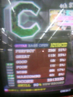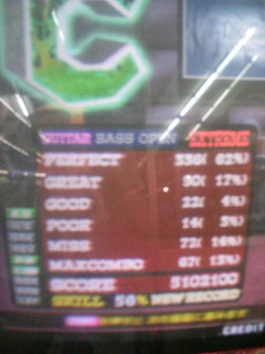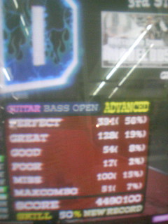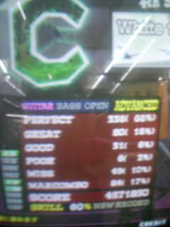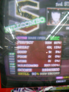 前回は称号を持っていなかったので、参加できなかったのですが、今日から始まったようですね(^^;今日は仕事が早く終わったので、お休みのKE-KOさんを誘ってゲーセンへ。KE-KOさんは緑杯頑張ってね~適当に~(笑ゲーセンには先客が・・・いるよ・・・クラッシャーさんがorzしかも緑ネームとかになってるよ、このクラッシャーさん。少し後ろで見ていると、体がガチガチで明らかに反射神経で叩いてますね。あー、こんな緑ネームならなりたくないですね~さて、ドラムやってみました。明鏡黄→?→RockStar赤→恋は臆病赤あれ?2曲目何やったっけ?(笑忘れた(ぉぃぉぃまぁいいや。この中で、自己べキターーーー!恋は臆病で、微妙に1%更新(笑ついに大台の80%になりました~この曲はあまり気にせずにのびのびとやった方が良い成績がでるみたいです(^^)ギターの方では、真・抽選王が始まってましたので、やってみました~!とりあえず、全部ギターで。○1曲目は緑で・・・香港超特急 SS○2曲目は黄で・・・タリホー フルコンS○3曲目は黄で・・・・・・・・・・・・overthere糸冬了でも、結構終盤まで頑張ったんですよね~にしても、ひどい引きだ(笑この辺でなにやら痛そうな客が来たので、店を変えることに(^^;で、スタバによるついでに元ホームに行ってみる事に。音ゲーにお客はいませんでしたので、ギター抽選王のリベンジを(^^;再びギターでチャレンジ☆○1曲目は黄で・・・Stop Spinnin' me in circles Aorz○2曲目は黄で・・・・・・・・・・・・Timepiece phase2糸冬了何だ、この引きは?それとも、抽選王はこういうの引く仕様か?そして、スピニンAって(爆死まったくもってまとも4曲できないので、4曲出来るまでやってみようと思い、何度か抽選王をやってみました。3回目でなんとか4曲できましたが、点数は1回目の方がよかったです(笑続けて4回目。すべて黄ギターです。○1曲目・・・Save a little something○2曲目・・・・・・・・・・・・・・・overthereなんかおかしくないか?しかし!!!!奇跡だ(笑しかも、イントロ繋がったし(爆○3曲目・・・Funky sonic world○4曲目・・・burntいやぁ、ひどい仕様だ。。。ついでにドラムも抽選王やってみました。アソビのつもりで全部赤でやってみました(^^;○1曲目・・・・・・・・・white tornade○2曲目・・・micro fin○3曲目・・・Charismatic○4曲目・・・・・・・・・君のとなりにやっぱり仕様か・・・(爆