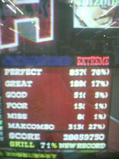 明日で終了なのですが、なんか順位が微妙な位置にいるのと、さんちぇさんのコメントを見て、「確かにまだ詰めきれてないなぁ」と思ったので、あと2日ですが、最後までやってみる事にしました。で、KE-KOさんの仕事が休みなので、私の仕事が終わった後2人で行くことに。今日の時点で自分の順位は53位でした。くっ、やはり50位圏外に押し出されたか。まぁ高得点出したのが1曲じゃ仕方ないですね。。。これでも、頑張ってるんだけどなぁ・・・って事で、詰められそうなものは、やはりカリスマさんとinfinite。あわよくばPassionとFT2かな?FSWは自分にとってはすでに論外です(笑あれは、緑ネームでも繋げられる人いるのか?って気がしますし(爆♪カリスマさん 数回やって最後のプレイでいつも切断していた箇所が接続! キタ! フルコン見えた! と思った矢先、やはり切りましたorz しかし、newレコードキタ! ピロッ。 小数点第2位が動きました_| ̄|○ 75.38pt 昨日から0.03pt上昇(笑♪infinite 何回やっても何回やっても、この譜面が繋がらないよ~ スネア連打で1発逃してミスでる~(爆 _| ̄|○ そんな中いつも切る箇所で予定通り切断。 しかし、それ以降全部繋がった! キターーーー! newレコード!! 28pt程アップ。 でもやっぱり繋がらない~♪Passion 先日神が繋いだこの譜面。 アカギの言葉を借りるなら「天に触れど、天を掴めず」ってとこで、 miss1でした_| ̄|○ 超おしかったですが、今まで繋がった事のない箇所で切っているので、 ある意味現時点での自己ベストです。 これも26pt程アップ。♪MODEL FT2 一応理接ではありますが、全く持って忙しすぎです。 毎回違う場所で切れるし、Sが安定しません。難しいよね。。。 自己べは出ませんが、なぜか結構粘着してます(^^; って事で、今日の空色杯は終了。 順位を一応50位以内に戻しましたが、明日また落ちてるんだろうなぁ・・・ そういや、公式で確認が出来るようですが、自分のPCからはXMLエラー連発で まったく見ることが出来ません(笑 すげぇスリルとサスペンス(爆ここまでやってみて思った事。1.このあたりの曲(Lv50~60)でクセのある黄譜面。2.手っ取り早くSPがあがる高難易度赤譜面や、フルコン難易度の低い同レベル帯の曲。だいたいの人は2ばっかやるよねぇ。しかも、空色あたりの人だとやっぱ上見る人だとこのあたりおろそかになっちゃうのはしょうがない気がする。これだけやっても、自分のSPにはVOIDDDしか反映されてないわけで、苦労したのに割が合わないと感じたらやる人減りますよね。なので、あまりSPを気にせずに続けてきた自分には有利だったのかもなぁ。黄譜面がどれだけ出来ても、赤に劇的な反映がなされるわけじゃないですからね(^^;赤を攻略したけりゃ、やっぱり赤やるしかないですからね。もちろん黄を攻略することが全く意味を成さないわけではないですけどね。おまけ。空色杯各曲の選曲回数(中間発表)もちろんトータルの回数なので、他の杯やスタダで選んでいる数も入っています(^^;・カリスマさん 26回・FSW 8回・infinite 17回・MODEL FT2 21回・Passion 16回・VOIDDD 5回FT2やりすぎだろ_| ̄|○