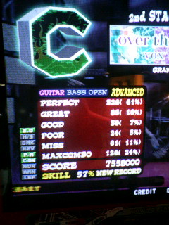 さて、夜勤明けです(^^)昨日はKE-KOさんと朝練に行きました。どうやら、私は特攻ネタ担当になっているようなので、早速ギタフリの特攻記録をば(爆▽with KE-KO▽・over there 緑ギター 二人ともアーケードでは初クリア!!私はCSでもクリアできてないので嬉しかったです(^^; 前作から数えて10連敗くらいしてましたので(^^; にしても、本当に難しいですよね(^^; もう当分やらなくていいや(笑・panasonic youth 黄&緑ギター 私は超チキンで前作まともに出来なかったので、緑に逃げました(笑 KE-KOさんは右腕がつらいとか言ってましたが、さっくりクリアなさってました(爆 ・white tornade 赤ギター(k)&ベース(つ) 両者KO負け 勝負タイム・・・つっこみ割と早く。KE-KO高速オルタあたり。 まぁ、無理だね。うん。無理。△個人的特攻記録と快挙△・classic party3 黄ギター 初クリアキター! 最後は逃げ切った感じ(笑 まぁ当然まともにできないので、成績はアレですがまぁクリアマークがついただけすげぇッス(^^;・R#1 黄ギター あんなオルタ出来ません(笑(あははははははは・ツミナガラと彼女は謂う 緑ギター フルコンキターーーーー!一方ドラムの方では、相変わらずちゃんこが強い(笑まだやってたのか、オレ(爆とりあえず、黄色で苦手だったスネア&タムのリズムをかなり掴んできた。あとはこれにバスを加えるといいわけですね(爆それよりも、達成率上昇の鍵を握る中盤のスネア×4→緑タム連打→赤タム連打。ここが黄でも繋がらないorzそりゃ、毎回エアーマンを歌いたくなるほどに(笑