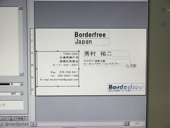 今日は午後いっぱい名刺作りに励んでいました。今までにもらったことのある名刺を参考に作りました・・・が・・・なんかあまり納得の行かないできだ。まぁそれでもきっと名刺もらってそのデザインセンス気にする人なんてそういないだろー。と今は気軽に考えることにしておいて、名刺のデザインに凝るのは渡す相手が増えてからにします。最近「ボーダー」についていろいろ考えています。考えれば考えるほど、つまるところは「人が幸せになればいい」ということになってしまい、「ボーダーをなくす」というのがいかに曖昧な考え方かが分かってしまって嫌になりつつあります。いや、あいまいなのは別に問題はないんです。オレは、「なんで世の中すんなりうまく行かないことが多いんだ?!」という不条理をなくしたいわけですから・・・。ただ、それを人に説明しようとするとどうも曖昧な感じにしかならない。もう少し煮詰めて考えた方がいいのは分かってるんですが・・・。でも航空チケットが売れて、本当に嬉しかったのは動かしがたい事実です。人の幸せとは?自分の幸せとは?世の中の人は何に困っているのか?それを本当に真剣に考えるようにオレがなった、それだけでもこういったことを始めてみたのは良かったなと思いました。オレを個人的に応援してくれる人!世界のボーダーを無くすことに賛成の人!→Blogランキングへ(クリックは一日一度まで)