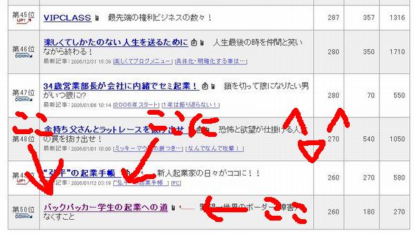 ちょっとちょっとちょっと!!速報です!!ある友人から聞いてびっくりしたんですがこれ!!見てください ↓ ↓ ↓↑ ↑「人気Blogランキング」2006年1月12日クリック時すごい!!すごいぞこれは!!(☆∀☆)ギュピーンなんか嬉しすぎて少しもらしそうになりました立ち上げてまだ9日しか経っていないのに!みんなそんなにクリックしてくれてくれたのか・・・。(嬉泣)ありがとうございますありがとうございます自分に投資をしてもらったようでとても嬉しいです!!^^でもねみなさん一つ気になることがあるんです。↑このページへのアクセス推移そうですその通りです、アクセスは順調に減り続けていますしかもなんだか嫌な減り方だサイトを立ち上げて以来、卒論に追われて時間が減る一方だったので、ブログ更新が滞っていたのが原因かと思われます短期でのブログランキングは上がっているのにアクセス数は減る一方そういわばまさにデッドクロス※株用語:短期の株価移動平均線が、長期の移動平均線を上から下に突き抜けること。一般的に、株価が下がる前兆とされる。・・・ブログを立ち上げて9日でデッドクロスに遭遇するなど夢にも思いませんでした。でもねみなさん、オレこんなこと言ってますけど、実はアクセス数よりもブログランキングが上の方が素で嬉しいです。だってここに来た人の多くがオレを応援してくれてるってことじゃないですか!ありがとうございますまぁでも実はランキングなんざどーだっていいんです。オレは、一人でもオレのことを応援してくれる人がいる・・・!という、その事実がメチャメチャ嬉しかったんです。(マジ仮にサイトが潰れても夢は潰さずに頑張り続けていきたいと思っている所存でございます※「仮に」ですよまぁ、とは言ってもオレ、特技は人の期待を意図せずして裏切ることなので、期待を裏切る形ですんげ~のし上がるか、潰れるかのどちらかの結果になると思います(笑)ところで、このBlogランキング、誰がクリックしてくれたか分かる方法、誰かご存知ないですか・・・??あれば本当に個人的に感謝を表したいので、どなたか教えてください!!(>_