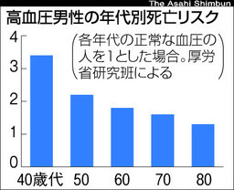 いつもありがとうございます。ツイてる抗加齢(アンチエイジング)実践家てるです。今日の1通目認知症、2035年には2倍の445万人に 厚労省推計厚生労働省が3年ごとに実施している「患者調査」の平成17年調査によると、高血圧の総患者数780万9,000人です。140/90mmHg以上を対象とすると、3500万人以上といわれており、多くの人が放置しているわけです。加齢とともに患者数は増し、50歳以上では男、女ともに50%以上になります。 高血圧の大多数が本態性高血圧といわれる原因がはっきりしない高血圧ですが、動脈硬化が進み、末端に血液が届きにくくなるから血圧を上げる自然の摂理です。高血圧の治療薬でよく使われている降圧剤は6種類で、・アンジオテンシン変換酵素阻害剤(ACE阻害剤):血圧上昇ホルモンを減少・アンジオテンシン2受容体拮抗剤(ARB):昇圧システム抑制・カルシウム拮抗剤:血管細胞へのカルシウム遮断・ベータ遮断剤・アルファ遮断剤・降圧利尿剤です。これらの降圧剤は、脳卒中や心臓病などの二次的疾患の予防のために必要ですが、いろいろな副作用があり、むりやり血圧を下げるので弊害として・元気がなくなる・末端に血液が届きにくくなり、認知症やガンの遠因になるなどが言われています。動脈硬化の予防はもちろん、進んだ動脈硬化を戻すことも可能なので、降圧剤に頼らないQOL(生活の質)の高いよい方法は知られていません。ツイてる抗加齢実践家の私の血圧は100~110/60~70mmHgで、若い頃からほとんど変化していません。関連ブログ沖縄の伝統食が高血圧予防に有効である可能性 チャンプルースタディ60歳未満男性の循環器死亡、高血圧と喫煙で6割が説明可能高血圧 忍び寄る危険 自覚症状なし、適正値知らず鎮痛剤常用 高血圧リスク3割増一般的な鎮痛薬が男性の高血圧の原因に緑茶:高血圧などに効果 掛川市立総合病院医療研究センターが発表植物性たんぱく質の摂取量と血圧は逆相関する、日中英米の国際研究で明らかにカフェイン入り飲料と高血圧リスク上昇、コーヒー○、紅茶△、コーラ×高血圧治療は生活改善から 学会が指針*******************************************************************高血圧の40代男性が死亡する危険性は、正常な血圧の人の3.4倍に上ることが、全国13の研究グループの調査を統合した厚生労働省研究班の初めての解析でわかった。高齢男性では1.5倍前後なのと比べてはるかに高く、「高血圧は中年ほど要注意」という傾向が出た。 対象は40~90歳の男性約6万5千人、女性約11万人で、同種の国内調査では過去最大規模。70~90年代に血圧など健康状態をみて、その後約10年追跡したところ、男性約1万人、女性約8千人が死亡。血圧と死亡の関係を調べた。高血圧と関係が深い脳血管の病気がある人は除いた。 その結果、収縮期血圧120未満/拡張期血圧80未満と正常な人たちに比べ、160以上/100以上の高血圧の人たちが死亡するリスクは、男性で40代が3.4倍、50代2.2倍、60代で1.8倍、70代で1.6倍、80代で1.3倍だった。 女性は40代で1.4倍、50代1.9倍、60代2.1倍、70代1.5倍、80代1.2倍。男性では若い世代ほど危険性が高くなる傾向が際だった。これらの人がもし正常血圧であれば、全体の死亡者は男性で23%、女性で18%減る計算という。 140以上/90以上と軽症の高血圧でも、危険性が高まることが確認された。 高血圧は塩分の多い食事や肥満、飲酒、ストレスが招きやすく、働く世代の生活習慣と関係が深い。解析を担当した滋賀医科大の村上義孝・特任講師は「若い世代のリスクがこれほど高いとは驚いた。血圧の異常は放置しないでほしい」と話す。(出典:朝日新聞)