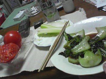 今日は一人だ。晩御飯どうしようかな~。冷蔵庫を開ける。適当に物色する。さあ、適当に作ろう。中華鍋に火をつけて加熱さす。缶ビール片手に青梗菜を鍋に放り込む。あっ、最初にニンニクのスライスを入れとかなきゃね。そして鶏ガラの素をいれて~オイスターソースを適当に入れる。紹興酒も適当に入れる。一気に炒める。へにゃへにゃにならないウチにゴマ油で香り付け。はい出来上がり。米がないのでトマトをかじろう。セロリがあったよ。\(^o^)/俺は野菜が大好き。いただきま~すbaby