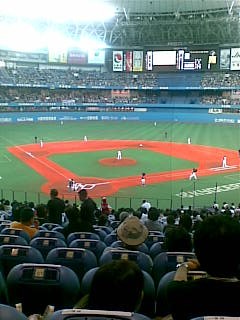 はい、まいどおおきに~あなたの3連休いかがでしたか?えっ??何? 聞こえませ~ん!私はシャガール展に行くか大阪ドームに野球を観に行くか西京極競技場にラグビーを観に行くか家で寝てるか。。ノンマニーだからね。結局、ドームにオリックス対日本ハムを観に行きました。球場の雰囲気はこんな感じです。客の入りがイマイチだったような。。やっぱり何事もナマで観るのは最高ですね。それじゃナマステ。。なんのこっちゃbaby^☆ごきげんよぅ~バナナの皮だけのような日記でごめんよ。