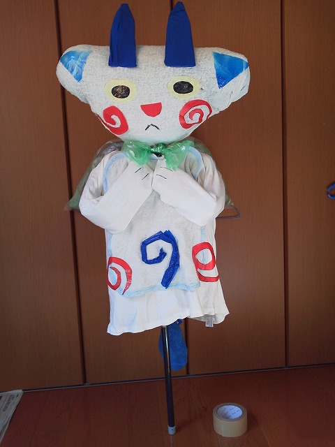 園庭の冬芝の種をなかよし会前に撒きましたで、毎年恒例らしい案山子コンテストがあるので作ってみましたちょうど捨てようと思ったモップの棒、中身は針金ハンガーや新聞紙さて似てるかな