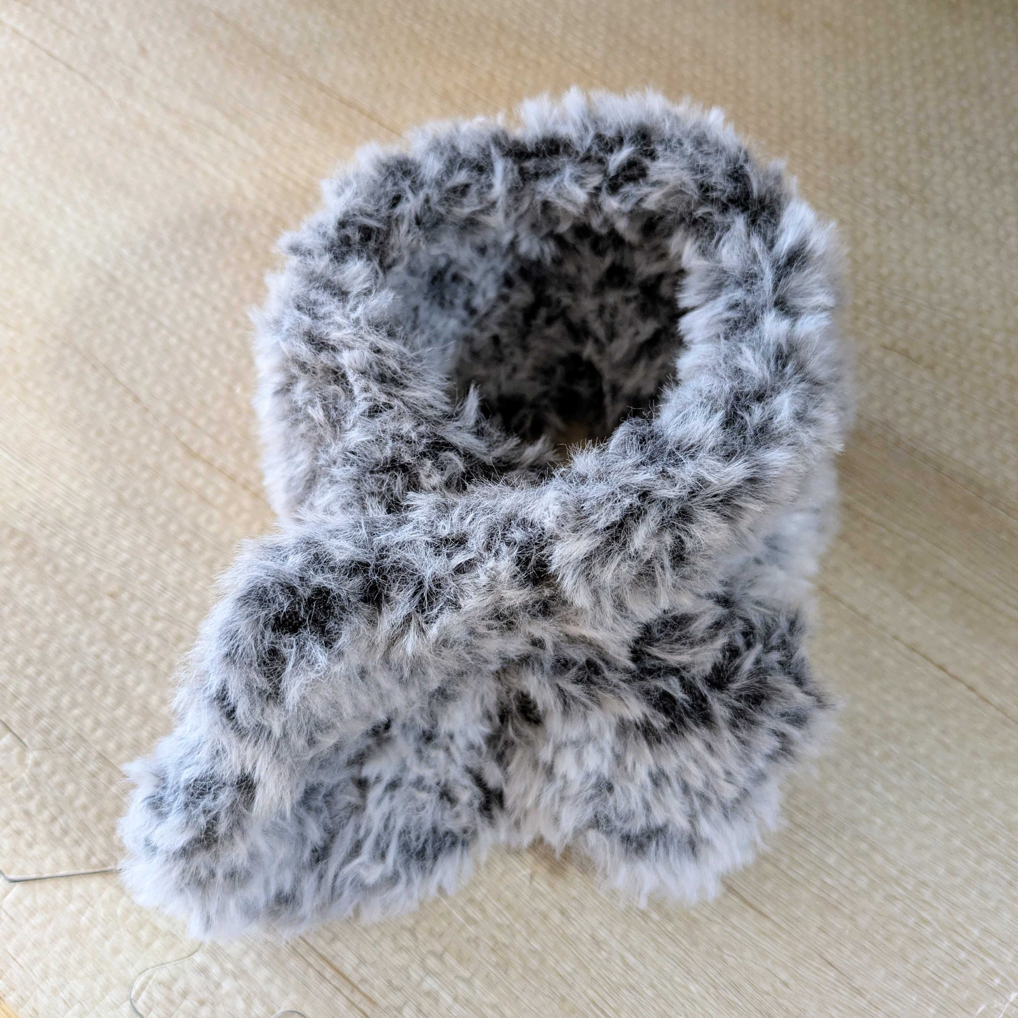 ふわもこの毛糸は編み目が見えないので、すごくざっくり編んでもなんとか形になるのがいいです。