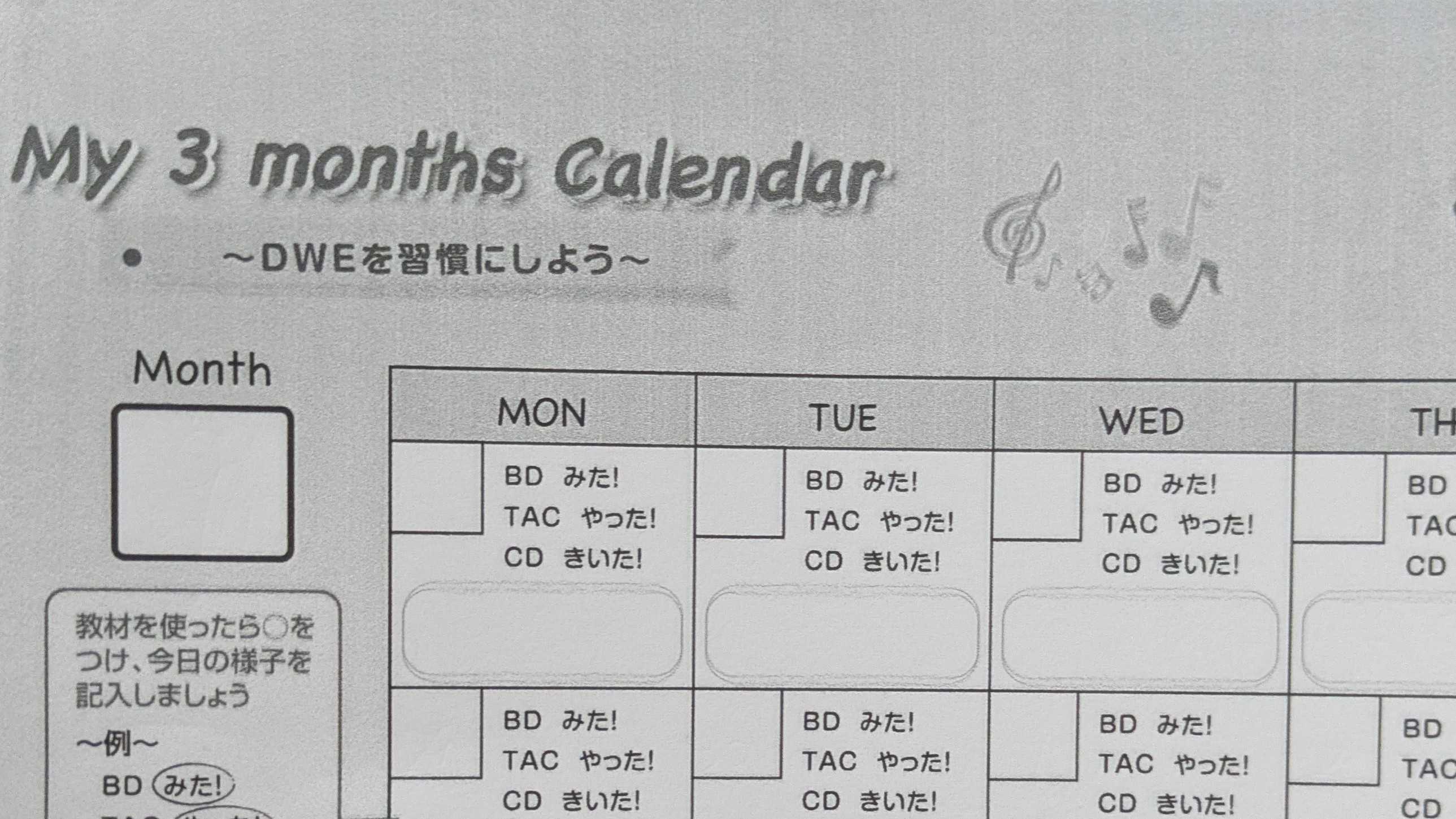 何事もはじめの数日は頑張るけれど、そのエネルギーが切れ出すのが三日坊主の私のダメなところ。でも、今回は踏ん張らなきゃ!続けられような工夫はたくさんされており、始めた3ヶ月はこのようなカレンダーをつけれるようになっています。これを使って、必ず毎日書きいれるために1日に1回必ず歌を聴くのを目標に、今日は夕方にプレイアロング1,2を一通り流しました。そして、昨日から始めたのが、ワールドファミリークラブという会員になると受けれるサービス。ワールドファミリークラブは、教材費とはまた別に月会費が必要です。上の子の年齢により値段が変わりますが、1歳7ヶ月以上からは月3740円になります。お金はかかりますが、私はこのサービスに一番魅力を感じて、入会しました。教材ではインプットばかりですが、それをアウトプットできる場がたくさんあるからです。その1つに、電話を使って先生と英語では会話ができるテレフォン・イングリッシュがあります。ただ、まだ会話ができなかったり電話がまだ難しい子には別のサービスが使えるようになっています。それが、事前に録画されている動画を電話しているかのように見れるe-pocketというものです。テレフォンのサービスを早めに使えるようになりたいので、それを使って電話しているかのようにやってみました。会話はできないので、歌を一緒に歌う動画を選択。何度か聞いたことがあるからか、真剣に見て、一緒に口ずさんだりしてたのでよかったです。週末は、それも使ってやってみようと思います。最後までご覧いただき、ありがとうございます!