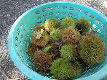 朝一番 庭の方から初代の声 例のごとく「お~い、クリが落ちちょんぞ 急いで草を刈っちょかんと・・・」 暑くて暑くてたまらない毎日ですが栗の産地からは「もう栗の収穫」の便りがテレビの ニュースでながれています 我が家のクリはどうだろうと木の上を見上げてはもうすぐかなあと話していました さあ・・これからは毎日「イノシシ」くんと競争です さっそく草刈りをして落ちているクリをひろいました 今年初めての栗拾い 大きさもバラバラ暑さのせいか皮は少し乾燥気味です 「これから いいのが取れるわい」と初代 皮をむく手が痛くなりますが どれだけ収穫できるか楽しみ楽しみ いよいよ待ちに待った秋到来です