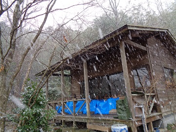 ちらほら 降る雪をながめては「 今日はつもるのかなあ~ 」と空を見上げる 看板娘の目の前の景色は見るまに吹雪のようになりました ひょっとして 雨や雪が降ってベランダがびしょぬれになっては大変と初代がブルーシートで 養生をしていました そうとうお役立ち 周りの景色は見るまに白一色 どれだけ積もるんだろう ちょっぴり本物の雪国の景色を想像してしまいましたが 本当に一瞬の出来事でした でも 寒いです・・・