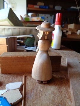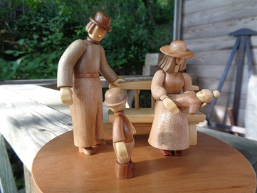 店の壁には看板娘が描いた木画が飾ってあります それを見たお客さんから看板を作ってほしいというはなしがあり 「 どんな感じがいいですか?」 「 この絵がいいです 」 「 じゃあ この絵のどこかに文字をいれますか・・・」 「 お願いします 」 と いうことで さっそく取り掛かることになり字体や色 どこに配列するのか・・・ 縦 横 30cmのカエデの板に描いたこの絵のタイトルは「宙と風と水と・・・」 なんだか自分でも恥ずかしいくらい壮大な・・・ 暑くて暑くてどうにもならないような日に ちょっと気合の入る出来事でした 今、初代は看板娘の絵の材料を用意しています 初代が取り掛かっているのがこんなに小さい家族の人形です きびしい暑さで少しペースを落としてやっています 小さな石臼の中にはカエルが3匹となりメダカと仲良く過ごしています 水の中は冷たくて気持ちいいだろうと思いましたが・・・温水プールのように なっています 今年は人間も庭の生き物たちも大変です