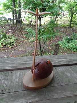 テーブルづくりが終わり ほっとしたのもつかの間 材料を引っ張り出して 作業台にはノミとトンカチ 次は何に取り掛かるのかとそうっと見ていたら「器」を彫りはじめました いつもは「さくら、けやき、・・・」定番ではない「紫檀」です 着色なしのこの色、大人な感じがします 次は「ブビンガ」というアフリカの木 赤みをおびたとても堅く重たい木です トンカントンカン 一生懸命に彫り始めると気がついたら肩が痛くなるという 副産物がつきものです 初代気を付けて・・・ そんなときの一休みはチ、チ、チと餌をおねだりにくる「やまがら」くんとの 時間です 看板娘は「やまがら」くんも大好きですが 散歩の途中で見つけた花を生けることです まるで「ホオズキ」の花、調べてみたら「ヒメセンナリホオズキ」のようです 次に散歩にいったら どんな花が咲いているかなあ~楽しみです