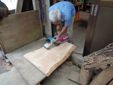 今日の気温は昨日までとうってかわって 涼しい気持ちのいい秋の雰囲気です 元気な初代もやっぱり気がつけば「夏バテ」・・・ でも 今日ぐらい気持ちのいい日だと仕事もはかどります 8月の一番暑いさかりに頼まれた「小さなテーブル」 材料は早くから「これ!」と決めて準備に入っていました 注文してくれた方も「暑いから無理せずにやってください」と そうは言っても もう一ヶ月以上お待たせしています 天板を仕上げないことには先にすすみません 今日はだいぶ進むんではないかと看板娘は期待しながら そうっと見ています 大きなテーブルはあるのだけれど 自分だけの専用のものが欲しいということです ミズメの板で作ることになりました ツルツルピカピカに磨きます あともうちょっと・・・ 毎朝「イノシシくん」が大暴れするところを地ならしをするのがこのところの 初代の朝一番の仕事です「今朝も来ちょるわい」と言いながら 一日がはじまり 積み木やお食い初めの器も完成 お食い初めの日に間に合いました 良かった~ さっそく「できましたよ~」 電話をしたら この器でご飯を食べる赤ちゃんと いっしょに受け取りにきました たくさん食べて元気に大きく育ってほしいです