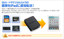 - iPad、iPad2でメモリカード内の画像データを直接読み込むことのできるiPad用カードリーダーです。