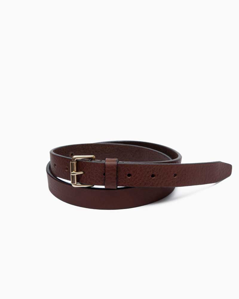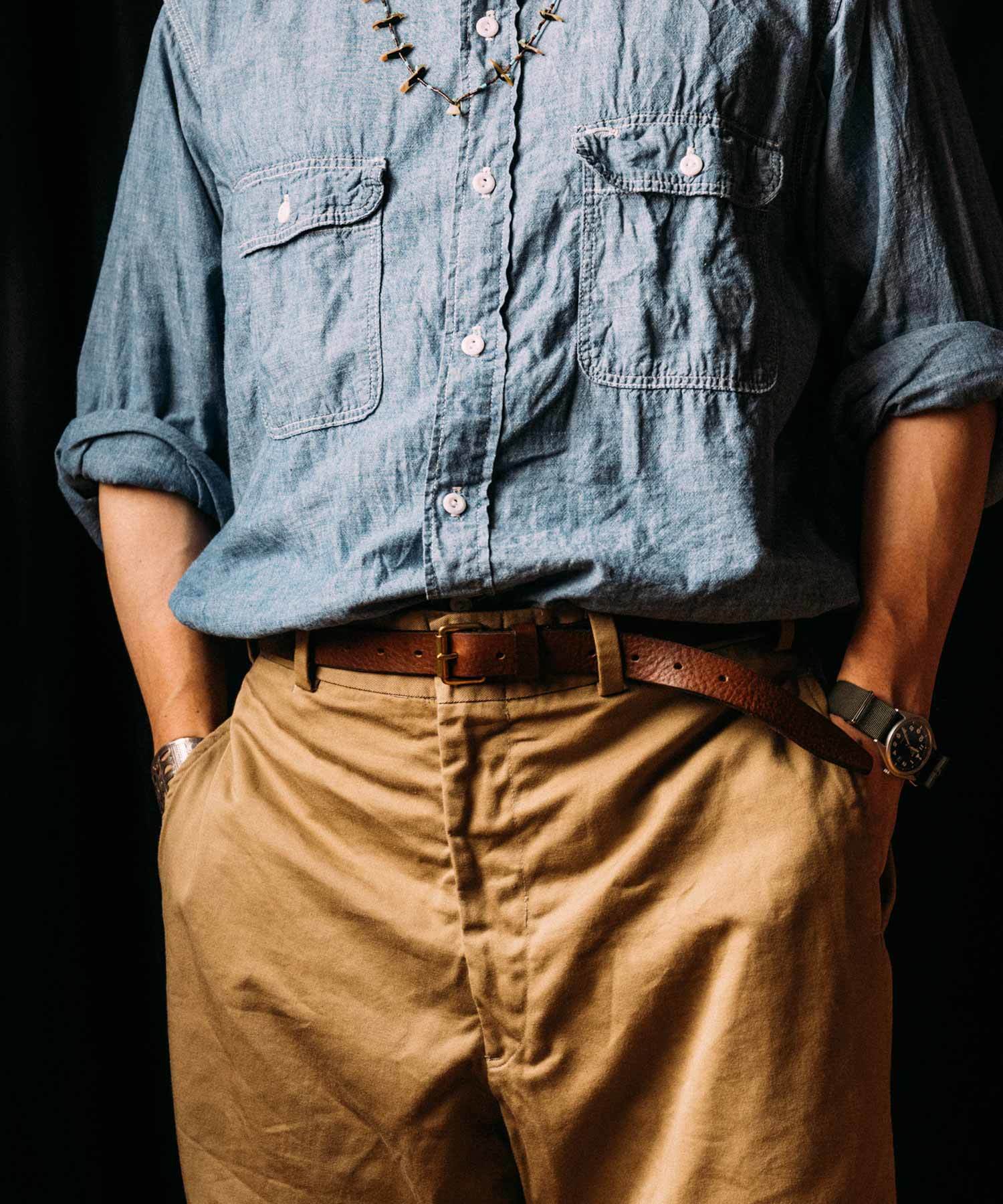 B2446は、ビンテージのミリタリーベルトをモチーフにして25mmのナロー幅で仕上げたカジュアルベルトです。小ぶりなバックルと細身のベルト幅はパンツを選ばす、ウエストをすっきりと見せてくれます。10穴のベルトホールは幅広いウエストサイズに対応するので、サイズアップを選べば長めのロングベルトとしてご利用いただけます。イタリア産のフルベジタブルタンニングレザーを天然染料を使って着色し、回転する大きなドラムの中でタンブル乾燥させて仕上げたサファリレザーを贅沢に使用しており、革は柔軟な柔らかさを増し、革本来の自然なシボをより強調させています。