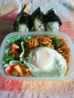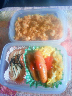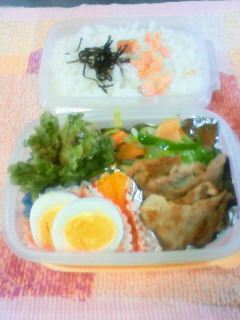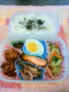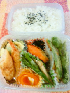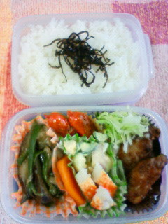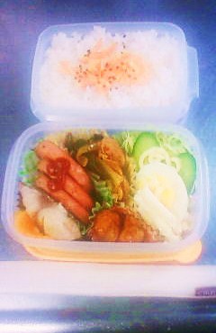 ・鳥の龍田揚げ・赤ウィンナー・かにかま・卵サラダ・茄子とピーマンの味噌和え・ご飯(昆布)母はEXILEを「いぐざいる」と言います。夜中の番組を見るぐらい好きなら、覚えろ!