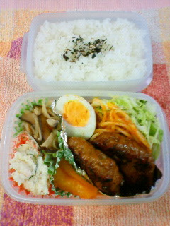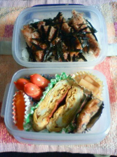 ・鳥の照り焼き(海苔まぶし)・卵焼き・赤ウィンナー・マスの龍田揚げ・おしんこインターネットにつながらなくて、1時間以上もトラブル解決本読んでいたけどつながらず、プロバイダに問い合わせしようかなと思って、ふと見ると、モデムのコンセント誰かに外されれてた。まったくもー!でも、ほっ。