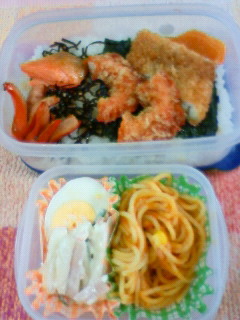 ・のり弁風 ご飯・昆布の佃煮・海苔・タラフライ・いかフライ・しゃけ・赤ウィンナー おしんこ・ナポリタン・ゆで卵・マカロニサラダおっぱいバレー見てこようかな