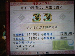 中国の奥地って感じでいい味出してるよ渓流日本とはまた違った風情で癒されるわ~これでトライのモガの森みたいにいつまでも居れたら最高だったのに…っとまぁそんな感じで現在村クエ消化中☆1はクリアして現在☆2を攻略中♪オトモはとりあえず最低限の2匹を雇ってますしかし見た目までいじれると愛着もひとしおだわ~片方はアイルー村の特典鎧にユクモの三度笠に木刀もたせて和風もう片方にはブナハ鎧にブナハ剣をもたせて洋風に被り物の種類も豊富で色々と個性持たせてあげれるのがうれしいわ~しっかしギルドカードの機能も増えたねまさか自キャラとオトモアイルーをポーズ指定して載せれるとはwこういうちょっとした遊び心のある追加機能はうれしいな~で、☆2のとあるクエストでパッケ絵にもなってるジンオウガが乱入してくるんだけどほぼオープニングのノリで遭遇→狩猟って流れになりますその時の状況を文章で表すとこんな感じ―――――――それは突然の出来事だった 依頼の狩猟を達成して帰り支度をしている最中 渓流の隅々にまで轟くモンスターの咆哮 張り詰める空気、更新されるクエスト情報月に照らされたエリア5にそいつはいた。―――――――――で、戦ってみた感想だけど楽しいwメリハリのある攻撃に充電で技の威力を上げてくる演出フル充電状態のジンオウガのかっこよさはすごいただ連戦&序盤でろくに弾薬を持ち込んでいなかったからとりあえず動きを覚えようと1死するまで粘ることにで、その1死するまでの間に頭(角?)破壊に成功部位破壊報酬で「雷狼竜の甲殻」をゲット!んで色々と開放されたジンオウガ武器のひとつがこの「王砲ライド」今回装備デザインの遊び心も半端じゃないなwいや~マジで楽しめそうだP3