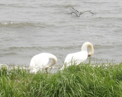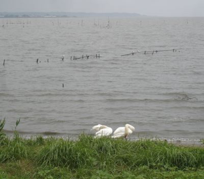 岸辺に白い鳥が二羽。
