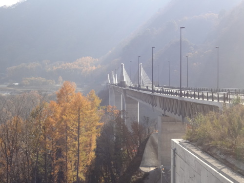 帰りに立ち寄ったのは、例の工事中止だの続行だので世間をにぎわせた八ッ場(やんば)ダムの場所です。巨大な橋が沢にかかっていました。背景の山々に映えて大変美しい橋です。フランスのミョー橋を連想させる美しさです。でも、本当にこれだけ立派にお金かける必要があるものなのかと、疑問にも思えた風景でした。おそらくそれだけ橋げたを高くしないとだめなほどダムの水深は深いということでしょうか。この辺りは昔から地滑り地域と言われているようであり、ダムなんか作るとなおさら地滑りを誘発しないか疑問です。それにせっかくの美しい吾妻渓谷を水没させるなんて愚かな人間の所業です。投入した多額の税金はすぐに土砂で詰まってしまうでしょう。諸行無情の響きあり・・・本当に愚かです。