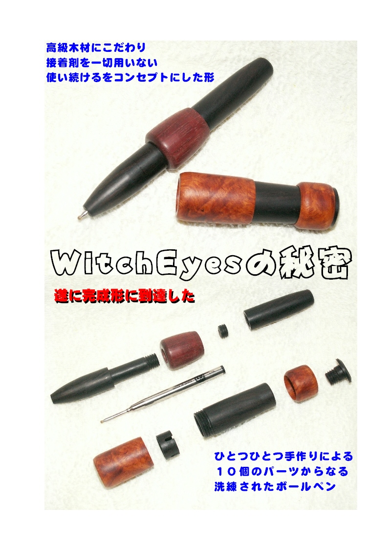 遂にひとつの完成形に到達しました。遂にここまできた手作り木製ボールペン外見のデザインはまだいろいろ変化させますが、基本構造はこれで決まりです。結合はネジ止めを基本にした分解可能な構造で、以前は微妙なサイズの違いを吸収するためとはずれ防止のためにキャップとの勘合部に使用していた「すべりテープ」も廃止して木で代用したことです。これで芯以外はすべて高級木材です。名づけてそのまま「WitchEyes」と命名しました。WitchEyesのWitchEyesです嬉しくて思わずチラシを作ってしまいました