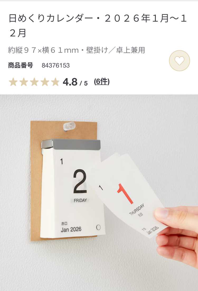シンプルで良いですね。消費税込みで890円。>>1日1ページに年月日/曜日/祝日/六曜/月齢を表示した日めくりカレンダーです。上部の穴を利用して壁掛けに、台座を組み立てて卓上に、お好みの使い方を選べます。(台紙サイズ:約縦122×横85mm、日めくりカレンダー本体:約縦97×横61mm)※1枚ずつ真下に引き抜いてください。残った両端の紙片は取らないようにご注意ください。との事。