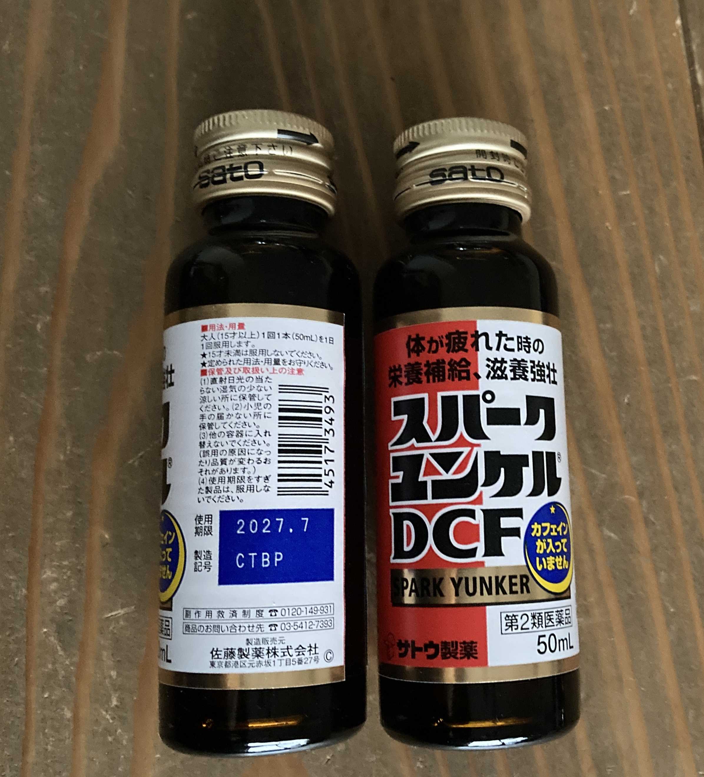 最近、栄養ドリンクはこれ一択です。箱買いしてます。カフェインレスなので、寝る前に一気飲みしてから寝ます。飲んだ瞬間から元気が出るような気がします。笑!おすすめです。>>【スパークユンケルDCFの商品詳細】●イカリソウ、黄精、大棗の3種類の強壮生薬にビタミンとタウリンを配合●カフェインフリー●飲みやすい味で、若いサラリーマン、学生、女性にもおすすめです。【効能 効果】・滋養強壮・虚弱体質・肉体疲労・病中病後・発熱性消耗性疾患・食欲不振・栄養障害・妊娠授乳期などの場合の栄養補給【用法 用量】・大人(15才以上)1回1本(50mL)を1日1回服用します。※15才未満は服用しないでください。※定められた用法・用量をお守りください。【成分】(1瓶(50mL)中)イカリソウ流エキス:300mgオウセイ流エキス:300mgタイソウエキス:120mgタウリン:1000mgビタミンB2リン酸エステル:5mgビタミンB6:10mgビタミンB12:10μgニコチン酸アミド:25mg添加物:クエン酸、DL-リンゴ酸、コハク酸、白糖、スクラロース、アセスルファムK、安息香酸Na、パラベン、ポリオキシエチレン硬化ヒマシ油、カラメル、pH調節剤、香料(グリセリン、プロピレングリコール、バニリン、L-メントール、エチルバニリンを含む)、アルコール0.5mL以下※本剤はビタミンB2リン酸エステルを含有するため、本剤の服用により、尿が黄色くなることがあります。※本剤は生薬エキスを配合していますので、わずかに濁りを生じることがありますが、効果には変わりありません。との事。こちら ⇨ スパークユンケルDCF(50ml*10本入*2箱セット)