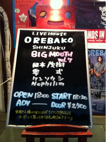 初めて来ていただいた方に 昨日、零式のバンドライブがありました。 今回は岡本茂樹さんのBig Mouthというイベント 10年ぶり7回目の「大口を叩く」この企画 以前はメジャーデビュー前の オレンジレンジやアジアンカンフーも出たそうです。 零式は4バンド中3番目 前回に引き続き、保坂城太(ホサカ ジョウタ)さんが ギターでサポートしてくれました。 各バンドの演奏が終わって、ステージセッティングの時には、 インタビューがあったり、芸人さんがネタを見せてくれたり 客を飽きさせない趣向がありまして 零式の前には、何度か零式ライブに出演している豊岡ノリト。 彼は吉本を辞めて、今後を考えているようですが 豊岡パンチ!豊岡キック!のショートコントをいくつかやったあと 最後に、パイナップルを7つ並べて 「出(イ)でよ神龍!!(シェンロン)」と何度も叫びます。 何も起こりません。ちがうなぁ。。。そうだ! 出でよ零式!! これは来ました(笑) 感動さえ覚えましたから。 そして、零式のステージが始まったのです。 1曲目の「素晴らしき世界」♪さぁ 行こう♪ と歌いながら、朝真が両手を上げると 一緒に、フロアから、いくつもの零組リストバンドが上がります いつもの光景だけど 圧 巻 朝真がジャンプすると、フロアで飛び上がるのはぼくだけじゃなくて こんな一体感のある、盛り上がる時間は最後まで続きました。素晴らしき世界左手を握る人スタンドバイミーバード(ケンソウシの曲)モウモクツバメ隼 この日の企画の一つとして、別のバンドの曲を演(ヤ)ることになっていて 零式は上にも書いてあるように ケンソウシというバンドの曲を演奏しました。 「モウモクツバメ」の時だったと思いますが 朝真はフロアまで降りて来て、熱い歌を聴かせてくれました 汗だくの朝真でしたが、いい香りがした。 最後に登場した岡本茂樹さんは 最後から2つめに「スタンドバイミー」。 零式よりかなりアップテンポで、ちょっとパンクっぽい演奏が新鮮でした。