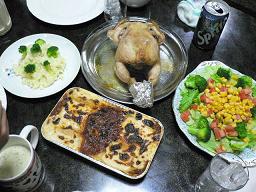 イブが終わるとなぜかクリスマスがおわってしまったような感がありますが、まだ今日がクリスマスとはいえ、我が家も夕べクリスマスディナーを済ませましたいつもは『ケンタッキークリスマス』になることが多いんですが、今年は無謀にも家でチキンをグリルしてしまおうということになり、昼間のうちに買出しに初の試みは・・・・・ ちょっと失敗オーブンの温度が低かったのか時間が短かったのか感動のチキンカットをすると若干赤い肉汁が・・・・・カットしたものをトースターであっためてなんとか口にすることができました。薄味だったけど、ジューシーでおいしかった来年からはコレで確定しそう・・・かな!?デザートは買ってきたスポンジにチビたちがデコレーションするといういつものスタイルでチョコレートケーキを作成。こちらは毎年のことなのでスムーズに、しかもみためもだんだんキレイになってできあがり クリスマス・ディナー