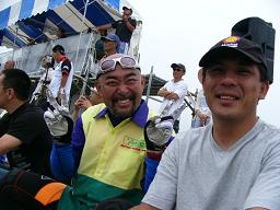 前日のピーカン天気から一転、曇天となってしまった日曜日。レース会場には続々と往年の(?)ライダー達が集結。懐かしい顔ぶれがアチラコチラで見うけられました。 我がチームでいえばこの二人 (名誉カイチョーとナツ○)さて、本題の決勝ですが・・・・・・・・・・・ Photo by おぼっちゃま 今回も 優勝 しちゃいましたスタート後サイドバイで並ばれたりしてヒヤリとする場面もありましたが、なんとかトップを譲ることなくゴールできました(ヨカッタ)でも、最近はカメラマン(?)として有名なアノ彼(!)を筆頭に次回からの参戦予定者が続々とのウワサもあり、ポイントリーダーとしておちおちしてはいられましぇ~ん 次回も負けずにガンバりますよォ~ (って本人も思ってると思いマス) 表彰式~今回もケガもなく無事終了することができました~お手伝いしてくださった皆さん、 あざ~~~っした