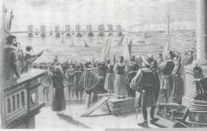 ハイチに贈る (4) 1493年5月、ローマ教皇の最初の裁定を得たスペイン両王とコロンブスは、ただちにインディアスにおける本格的な植民地建設に向けた準備に入りました。植民地はスペイン両王に献上し、コロンブスが総督兼副王となるというのが、両者の取り決めでした。この第2回航海では、第1回航海の成功を受けて、志願者が殺到しています。ですからコロンブスや遠征の幹部達は、人選に相当な苦労をしています。航海への参加者は、船員の外に兵士や植民者それに布教と伝道のための宣教師(僅か6名でしたが)を含めて総勢1200余名、17艘の大船団が編成されました。この船団が盛大な見送りを受けて、カディスの港から旅立ったのは、1493年9月下旬のことでした。下の絵は出港の模様を描いたものです。船団は、6ヶ月分の食糧、植民に必要な種苗、家畜、道具類も積み込んでいました。船医も乗り込んだ本格的な遠征隊でした。一行は11月初旬には、今日で言う小アンティル諸島に到着し、島々にスペインの旗を立てながら、ヴァージン諸島、プエルト・リコ島を巡って、11月下旬にエスパニョーラ島に到着します。1年前島に残った39名と感激の対面となったのでしょうか。浜辺の崖の上に築いた要塞はもぬけの殻でした。大砲を撃って到着を知らせても誰も現れませんでした。そうなんです。コロンブス提督が旅立った後、居残ったスペイン人たちは、征服者の本能を丸出しにして、多量の貢物を島の部族に次々と要求したのです。こうしたスペイン人の横暴に怒った島中央部の部族がやってきたスペイン人を襲って皆殺しにし、さらに残っていたスペイン人達も皆殺しにしてしまっていたのでした。エスパニョーラ島へのコロンブスの帰還前に、友好的な植民地建設の道は、既に閉ざされていたのです。島内にはなお、スペイン人に友好的な部族もありましたが、スペイン人への猜疑心の方が強くなっていたのです。こうして本格的な植民は、島民との敵対のなかで始まるという、不幸な出発となったのです。 続く