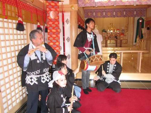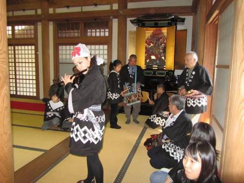 続・明けましておめでとうございます2日、午後1時スタートで、地元の寺社と老健施設を訪問し、獅子舞(悪魔払い)の奉納並びに慰問に行ってきました。 その模様をアップし、皆様への新年の挨拶に代えさせて戴きます。5枚目、6枚目が地元の名刹王禅寺での奉納、普段は閉ざされている本堂での奉納。最後の2枚が老人ホームでの慰問です。お年寄りは子ども達が大好き。終了後囃子方を務めた子ども達が、お1人お1人に、「来年まで元気でいてください」と声をかけてゆくと、皆さんの顔が輝いていました。