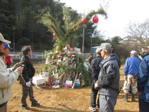 どんど焼き今晩は。 今日13日は、地元のどんど焼きの日でした。小正月に賽の神を祭り、門松や注連縄、書初めなどを燃やし、その残り火で手作りのお団子を焼いて食べ、今年1年の無病息災を祈る、この地域の伝統行事です。伝統に従うなら、14日に行うのが筋なのですが、成人の日が1月の第2月曜日に変更されてからは、連休初日の日曜日に行なうようになっています。風が強かったり、雨降りだったりした時に、順延できるからというわけです。というわけで、今年は13日の日曜日。風のないポカポカと陽射しの温かい、快晴の日曜日。絶好のドン土焼き日和でした。午前中に祠の準備、女性陣は子ども達に配るお断固と竹竿の用意です。昼にいったん解散して、昼食を済ませて午後1時に火入れです。会場は、地域の市街化調整区域に残る、個人の休耕田を御好意で拝借しています。出来上がった賽の神の祠です。2枚目、お神酒をかけてのお清め。祠には少々灯油をかけて、燃えやすくしてあります。子ども達代表と世話人代表で点火。勢い良く燃え上がりました。祠が燃えて熾きが出来るまで、お神酒や清涼飲料、蜜柑やお菓子を戴きながら、三々五々あちこちに輪が出来ます。後半の3枚が、熾きでお団子を焼いている所です。竿の関係で、最初のグループが焼きあがると次のグループへ竿をバトンタッチ。3回ほど竿が回って、午後3時半頃に終了。大人たちは、火の始末を済ませてから、ご苦労会。賑やかな飲み会になりました。