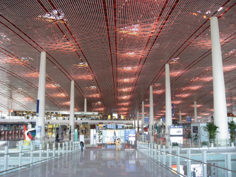 それでは、新しいT3内部を~~~南北2900m、幅790m、高さ45m、総建築面積98.6平方mで、世界最大級の空港らしいですそして登場ゲートの長さは、800m近くもあるそうです出発フロアは4階になりますこのように空港到着後、まず各航空会社カウンターにて搭乗手続きをしますそして、この龍の銅像から後ろが、国内線・国際線へと分かれて行きます一番奥の搭乗口まで歩くと約30分かかるそうです4階の出発フロアから、2階の国内線到着フロアへ壁画がありましたそしてT3と隣接する形の駐車場&エアポート鉄道駅へ(なんか外観の見た目が亀の甲羅に見えるのは私だけ)これがそのエアポート鉄道6月に開通予定だそうです(ホントは3月開通だと聞いたけど)横のボディはパッと見成田エクスプレスみたいな色でした開通すると約20分で空港(T3)~三元橋で結ぶそうです次にここへ来るときは、搭乗券を持って、乗客として利用するときですねぇ次ここへ来るのが楽しみですあっ、そういえば、インフォメーションで日本語のパンフの有無を聞いて、日本語パンフレットもらったら、そのお姉さんに、「日本語の発音を教えてくれませんか」と聞かれましたどうやら、簡単な日本語会話フレーズを覚えないといけないとのこと(と、いっても私も東京標準語できないんですけどねぇ)もし、阿波弁訛りの日本語を話すお姉さんに遭遇したら、私が日本語教えたと思って下さいT3ターミナルの空港職員、全体的にサービス態度が良かったように思いますまぁまだ利用客が少ないというのもあると思いますが写真撮ってたら、掃除のおばちゃんがフレームに入らないように止まっててくれたし、バス乗り場のおっちゃんは、挨拶がちゃんとできてたし(まぁ日本だと当たり前の事ですけど)ちょっと見直しました