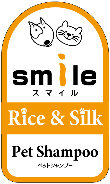 これまで、スマイルペットシャンプーのシールはシオンの内製で対応していたのですが、この度まずは東急ハンズ新宿店において頂いたこと、さらに渋谷店その他でも提案していることから、シールの耐水性をアップしながら、かつデザインを少し見直すことにしました。私的には今のデザインにちょっとイラストが入って親しみやすいものにしたいと思っておりました。そして、今回決まったスマイルペットシャンプーのラベルがこちらです。「smile」の部分はこれまでどおりにして大きなイメージは変えず、一方犬と猫のイラストを入れることで犬、猫いずれにも使えること、それと一番は親しみやすさを持って頂こうと思いまして、このようなデザインにしました。よくみると「Rice&Silk」の「i」のところの点のところがペットの足跡にもなっている、そんなユニークなシールです。今後、スマイルシリーズはこのイメージで展開し、スマイルペットシャンプーをはじめ、スマイルペットリンス、コンディショナーのようなものも取り組んでみたいと思っています。