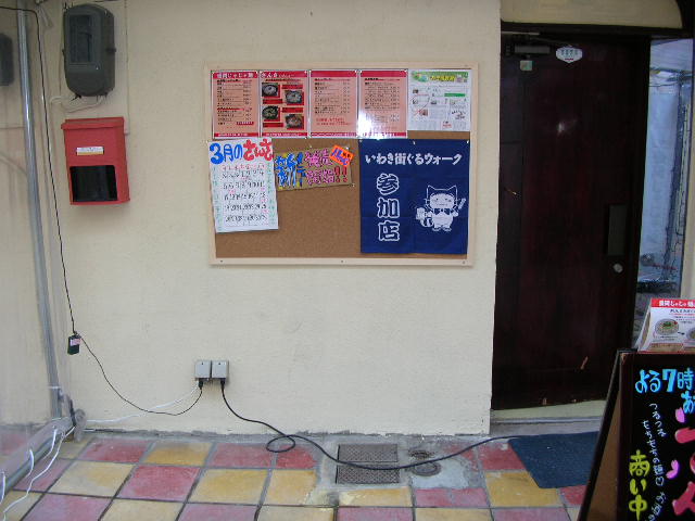 すみません、いわきに駐留している間、夜が遅いというか寝るのがほとんどAM6:00とか7:00で起きるのが昼過ぎ、その後ついついシオンの仕事にかかったりとで、日記の更新ができずにおりました。が、夕方以降は少し時間がとれるので、今度はfacebookをみなさんが始められる時間ということで、これも日記に手が届かない1つの要因に。。。。今やっている楽天ブログとmixiとfacebookが1つになると楽なんですがのぅ。なかなかそうもいかないか。。それはさておき、先日3/1辺りにfacebookではご紹介させて頂いた盛岡じゃじゃ麺「さんさ」の今の様子の写真を数枚アップしたいと思います。まずは、店の外観です。ドアが昔のスナックのときのままなので、ちょっと入りにくいのがネックなんです。もう少し稼いだら、ドアを付け替えたいと思います。なんとか、横のボードを使って親しみ感をPRできればと思っています。こちらは、3/1からの新メニューです。盛岡じゃじゃ麺は、ここいわき市で独自の進化を始めています。その第一段がトッピング。とりわけ、「塩ネギチャーシュー」。白髪ネギをごま油と塩胡椒で味付けし、そこにじゃじゃ味噌で煮込んだチャーシューを混ぜ、じゃじゃ麺と混ぜて食べると最高です。それと、外の看板は当店自慢の姫が作成したものです。今日から4日ほどは、盛岡のシオンにおります。そして、3/9からのいわきでのイベントにおいて新メニューの水餃子を出品すべく、3/9にまたいわきに戻ります。