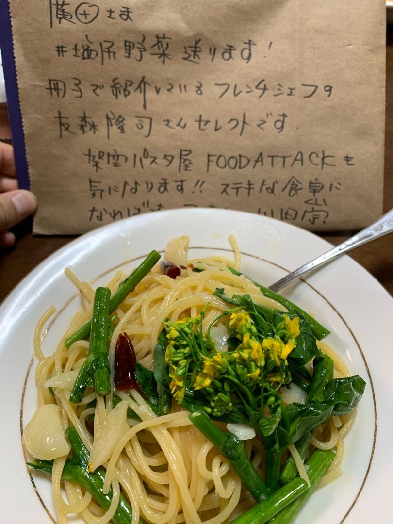 長野県塩尻市から届いた野菜達アスパラ菜を使ったペペロンチーノこんなパフォーマンスをしてくれる塩尻市野菜を提供していただいた"日本一おかしな公務員"山田崇さん 塩尻市のフレンチシェフの友森隆司さんに感謝です。第一弾はこんな感じで提供できました。あわせて架空パスタ屋 FOOD ATTACKのラグランも是非https://www.dub-design.online/items/29142976