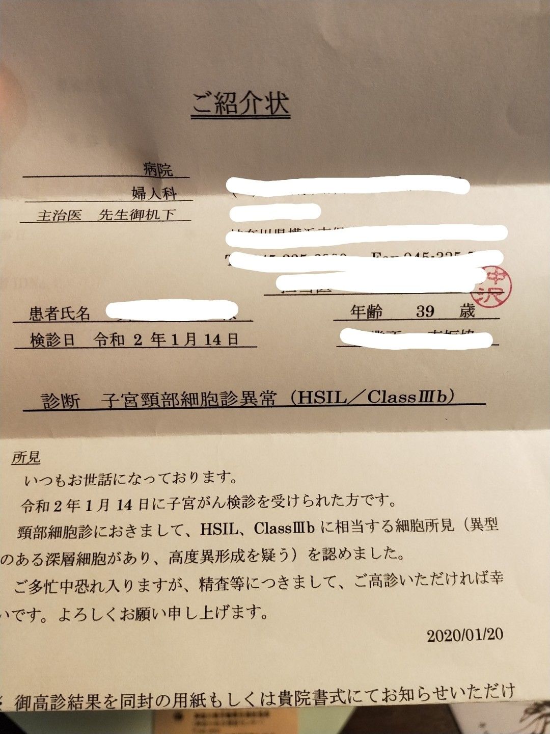 健康診断の再検査通知を受け取った翌日。同封されていた紹介状を片手にクリニックへ再検査へ。受付後、直ぐに名前を呼ばれる。内診台に上がるのヤダなーってドキドキしながら診察室へ。予め受付で渡していた紹介状を眺めながら、先生一言。「これは大きい病院行ったほうがいいですね」再検査自体はできるけど、その後の処置はうちではできないから、初めっから大きい病院行ったほうがいい、ということ。けいゆう病院と横浜市大のどちらか通いやすい方を勧められ、その日は滞在時間10分ほどでクリニックを後に。予想に反し大事になるのかな‥と不安になりながら、開封された紹介状を読んでみる。HSIL/ClassⅢってなによ?!ググるとやっぱり子宮頸がんってなってるー💦ガガーン😭でもさっきの先生は、再検査しても間違いでしたって事もあるって言ってたし、とりあえずは悲観的になるのはよそう。次の病院はけいゆう病院に予約。週明け月曜に行くことに。ダイヤモンドプリンセスのコロナ騒動の中、色んなことで不安に駆られながら帰宅した。この日、実家の親にも報告。