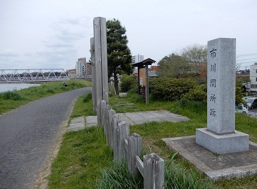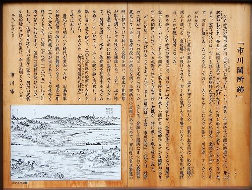 橋を渡ったところで目に入ったのは、市川関所跡の碑。​