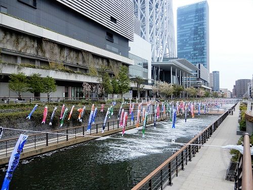 鯉のぼりを撮ろうとするとスカイツリーは足元のみ、両方を一枚の写真に収めようとすると、カメラを低くして斜めに傾ける必要がある。かくして撮った写真が下の1枚。​