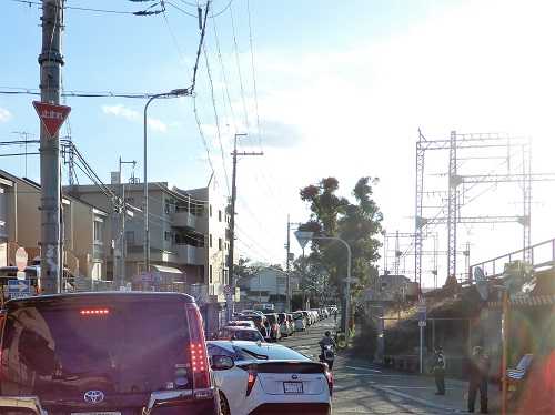 このガードから右(西)方向にもずっと車の列が続いていましたから、この地点に交通整理をするガードマンを配置しないと、信号機はあるものの、この交差点でぐじゃぐじゃになりそうです。